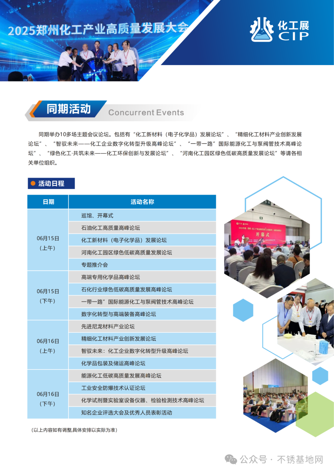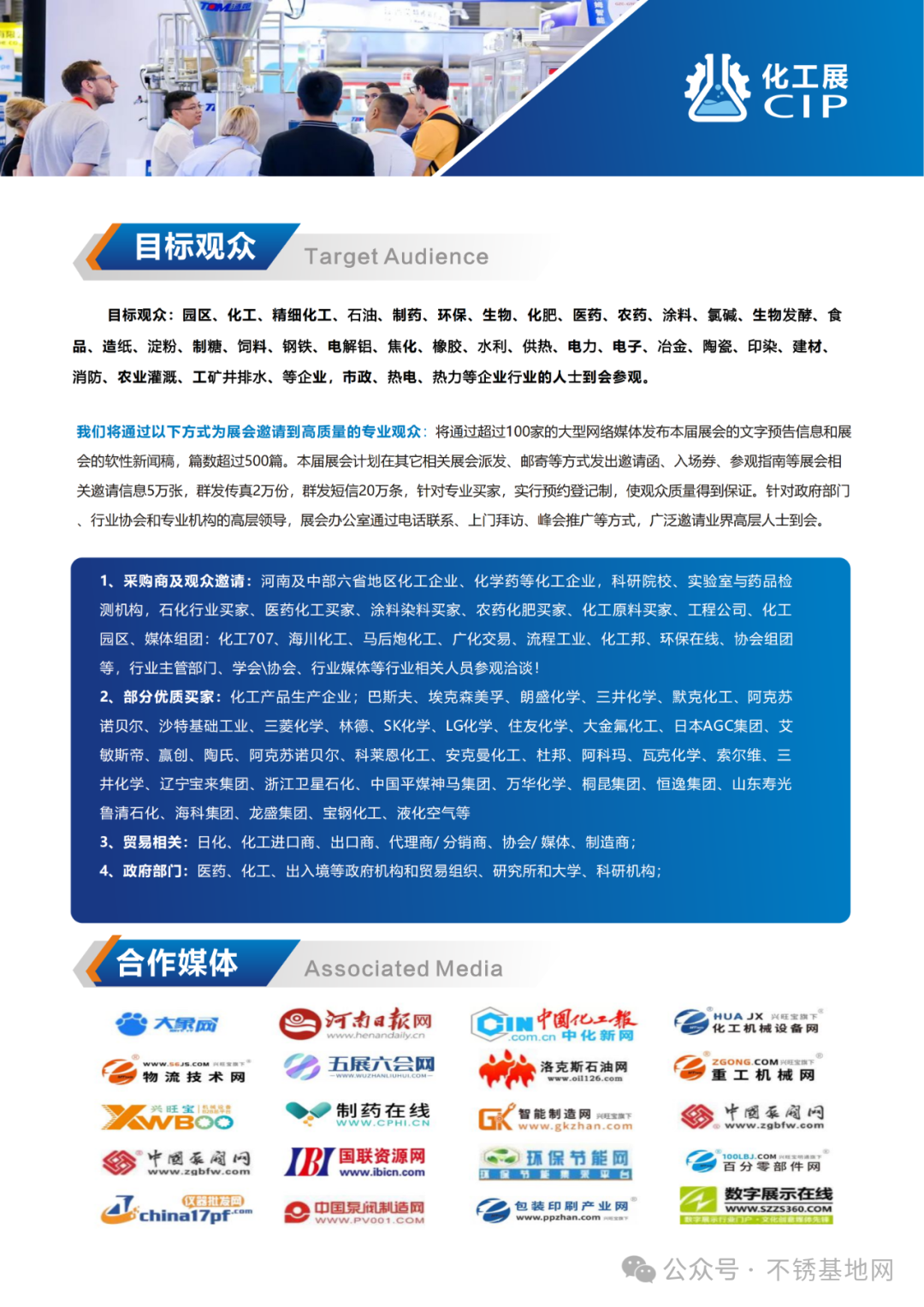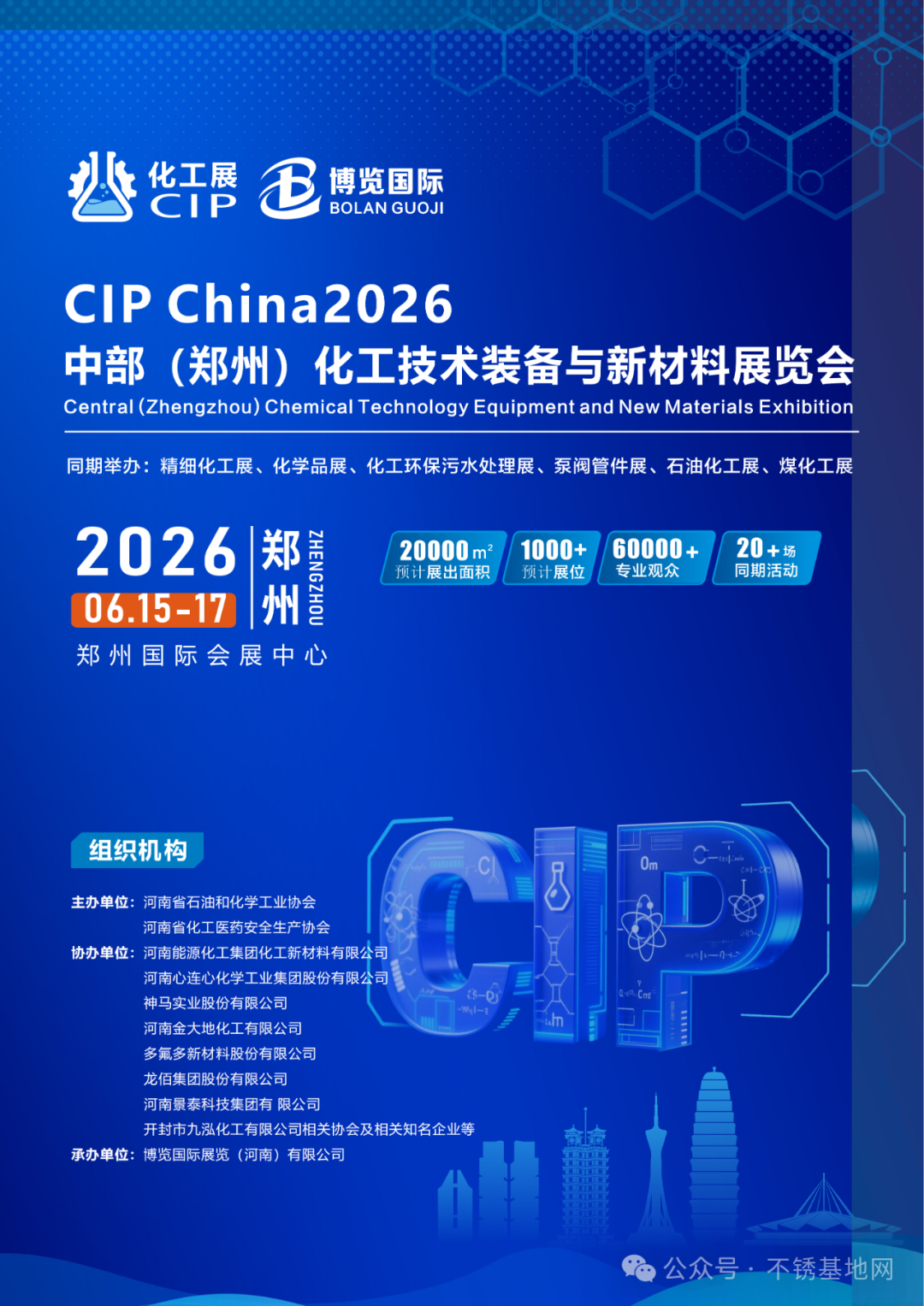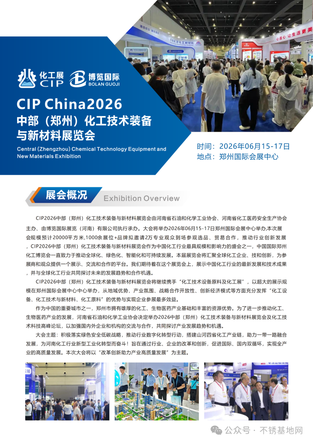 【国内展会】CIP2026中部(郑州)化工技术装备与新材料展览会发表时间:2025-10-15 00:00 CIP2026中部(郑州)化工技术装备与新材料展览会由河南省石油和化学工业协会、河南省化工医药安全生产协会主办、由博览国际展览(河南)有限公司执行承办。大会将于2026年06月15-17日郑州国际会展中心举办,本次展会规模预计20000平方米,1000余展位+品牌拟邀请2万专业观众到场参观选品、贸易合作,推动行业创新发展,CIP2026中部(郑州)化工技术装备与新材料展览会作为中国化工行业最具规模和影响力的盛会之一,中国国际郑州化工博览会一直致力于推动全球化、绿色化、智能化和可持续发展。本届展览会将汇聚全球化工企业、技和创新,为参展商和观众提供一个展示、交流和合作的平台。我们期待着在这个展览会上,展示中国化工行业的最新发展和技术成果,并与全球化工行业共同探讨未来的发展趋势和合作机遇。