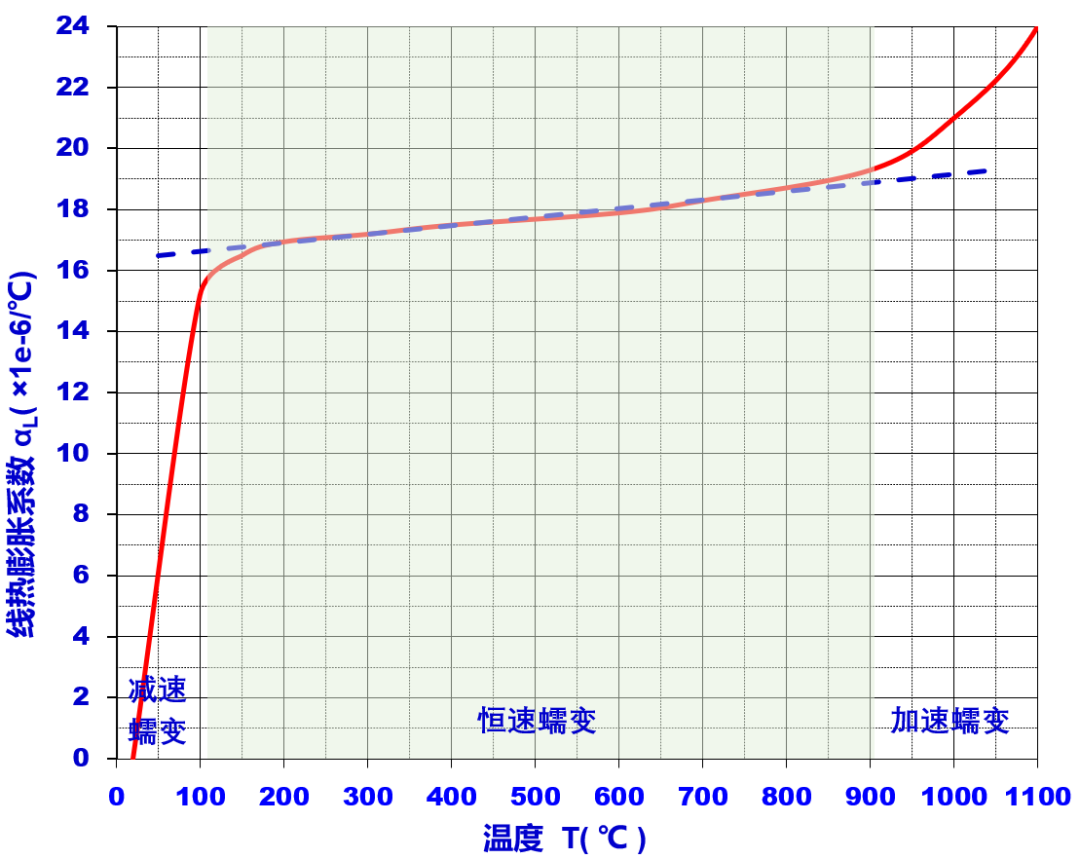 图3 蝶板密封性能设计流程图 首先,对蝶板在预期工作温度范围内的变形量进行详细评估,包括在正常工作温度及可能遇到的极端温度条件下蝶板材料的热膨胀和蠕变行为,以预测蝶板在长时间高温作用下的最大变形量,并确保这一变形量在安全范围内。 其次,对蝶板在不同温度下的材料强度进行校核,包括对蝶板材料在高温下的屈服强度、抗拉强度及其他相关的力学性能参数的评估。通过强度校核,确保蝶板在高温环境下不仅能够保持其密封性能,还能承受内部压力和外部环境所带来的机械应力。 综上所述,本设计不仅关注了蝶板与密封件之间的压缩量,还全面考虑了蝶板在不同温度条件下的变形和强度特性。通过综合分析,优化蝶板的设计,确保耐火型穿地通风密闭阀在高温环境下的可靠性和安全性,并满足工业应用中的高温泄漏要求。 3.3 分析输入 本模型专注于对蝶板进行分析计算,选取的材料为304L不锈钢。该材质在不同温度下的热膨胀系数遵循特定的变化曲线,如图4所示。分析计算分为四个阶段,每个阶段对应不同的时间和分析参数设置。 第一阶段(0.1 s):在此初始阶段,模型开启大变形分析,但不考虑蠕变效应,该步骤主要用于捕捉蝶板在瞬时加载下的响应。 第二阶段(0.1~480 s):此阶段模型关闭大变形,开启蠕变分析,模拟蝶板在持续应力作用下的长期行为,蠕变极限设置为10。 第三阶段(480~2700 s):此阶段继续进行蠕变分析,进一步观察蝶板在更长时间尺度下的蠕变行为。 第四阶段(2700~7200 s):此阶段为分析的最后阶段,继续进行蠕变分析,评估蝶板在整个高温暴露期间的稳定性和耐久性。