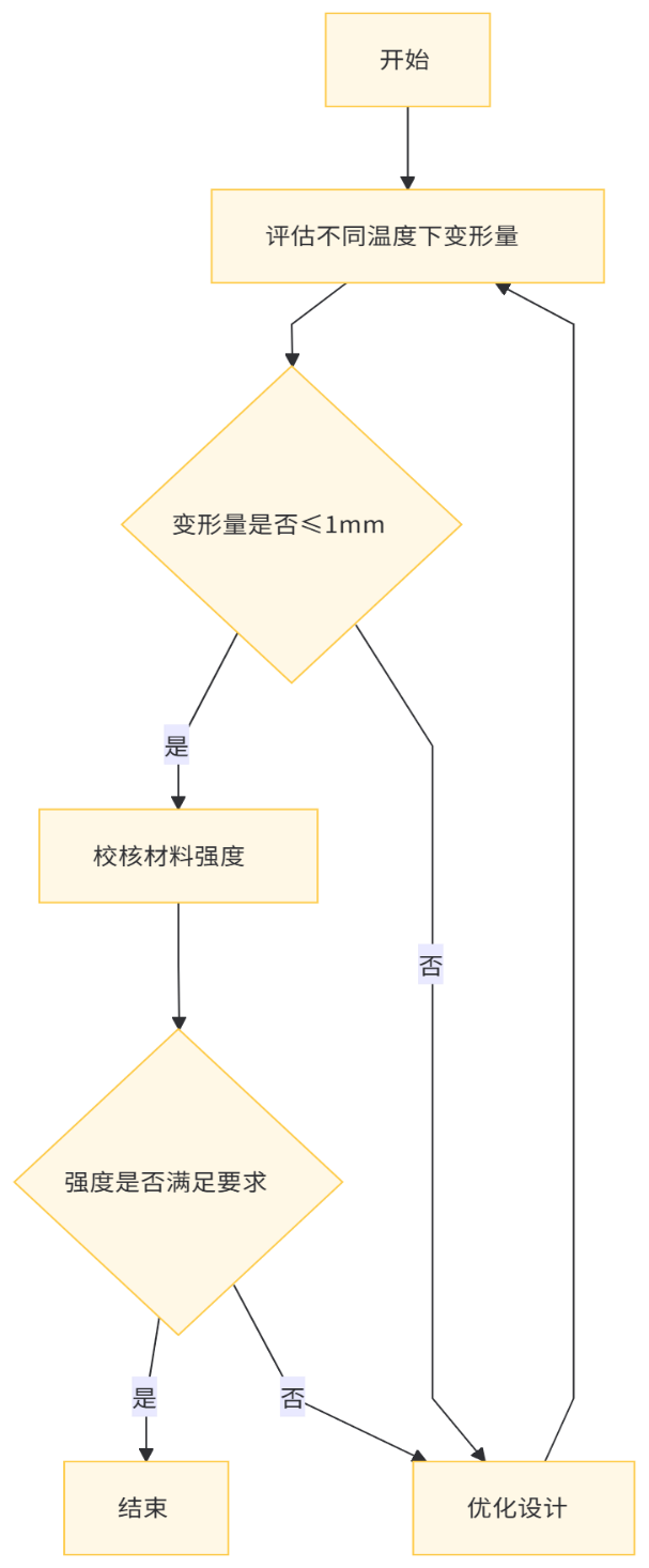 式中 ζ——蠕变应变(或蠕变应变速率) σ——施加的恒定应力,MPa t——载荷作用时间,h T——绝对温度,K 此方程为当前研究提供了一定的科学基础,用以评估304L不锈钢在高温条件下的蠕变行为,尽管是在低于极限工作温度的条件下提出,但未来工作将致力于填补这一数据空白,通过实验研究获取304L不锈钢在更高温度下的蠕变特性,以便更准确地预测和评估耐火型穿地通风密闭阀在极端条件下的性能。 3.2 判断准则 设计流程如图3所示,蝶板与密封件之间的压缩量设定为1 mm,这一参数对于确保阀门在高温环境下的密封性能至关重要。具体而言,在长达2小时(即7200 s)的高温暴露期间内,蝶板相对于密封件的变形量不超过1 mm,以满足严格的高温泄漏控制标准。为了实现这一目标,必须对蝶板在不同温度条件下的变形行为进行精确的计算和分析。