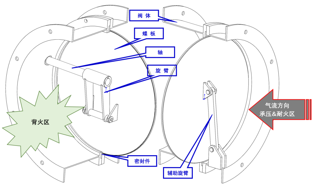 图2 耐火型穿地通风密闭阀阀体结构示意图 2.2 设计原理 本文所设计的密闭阀在关闭状态下,能够有效地将阀体两侧划分为背火区和承压耐火区。具体来说,轴和主旋臂均布置在相对安全的背火区,而辅助旋臂则位于直接面对火势的承压耐火区。这种布局是为了在发生火灾等紧急情况下能够确保阀门的关键操作部件不受火焰直接威胁。 当火灾发生时,火焰通常会顺着气流方向扩散。在这种紧急情况下,密闭阀迅速关闭,形成一道坚固的屏障。即使位于耐火区的辅助旋臂或其部件因高温而受损,但由于主旋臂和轴仍安全地位于背火区,能够继续执行关闭蝶板的操作,故确保了背火区的安全不受火灾影响。 这种设计不仅提高了密闭阀在火灾情况下的可靠性,还增强了整个系统的安全性。通过将操作部件隔离在不同区域,即使部分部件受损,阀门仍能保持其密封性能,防止火势和热量的蔓延,从而保护背火区及人员与设备的安全。这种创新的设计思路为耐火型穿地通风密闭阀的性能提升和安全保障提供了新的解决方案。 2.3 启闭动作原理 本文所设计的密闭阀采用精密的操作机构,通过驱动轴的旋转来联动主旋臂和辅助旋臂,实现对蝶板的精确控制。这一控制机制包括两个关键动作:平移和90°旋转。 (1)平移控制 操作机构通过驱动轴的旋转带动主旋臂进行线性运动,即平移。这一平移动作使蝶板在阀体内部沿轴线方向进行精确的位置调整,确保蝶板与阀座之间的接触位置准确无误。 (2)90°旋转控制 在平移的基础上,操作机构进一步通过辅助旋臂实现蝶板的90°旋转。这种旋转动作是蝶板开关的关键,确保蝶板能够从开启状态平滑过渡到关闭状态,或者反之。通过精确控制旋转角度,保证蝶板在关闭时与阀座形成密封面,实现零泄漏的目标。 这种复合运动控制机制不仅提高了蝶板动作的精确性和可靠性,还增强了密闭阀的操作灵活性。通过精确调控蝶板的平移与旋转,确保在各种工况下,蝶板均能迅速而准确地响应操作指令,实现高效密封。这种设计对于提高密闭阀的密封性能和延长其使用寿命具有重要意义。