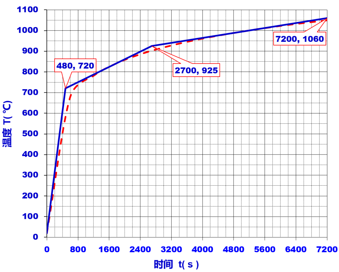 图4 304L材料线热膨胀系数曲线 温度对蝶板的作用同样遵循GB/T 9978.1-2008《建筑构件耐火试验方法》的温升曲线,分四个阶段输入模型,即0 s-20 ℃、480 s-720 ℃、2700 s-925 ℃、7200 s-1060 ℃,具体如图5所示。该曲线完整刻画了蝶板升温全过程,为热膨胀与蠕变耦合模拟提供精确边界。
