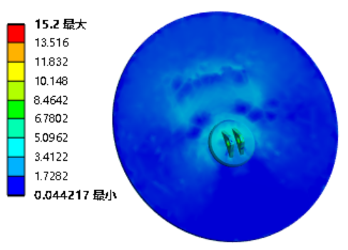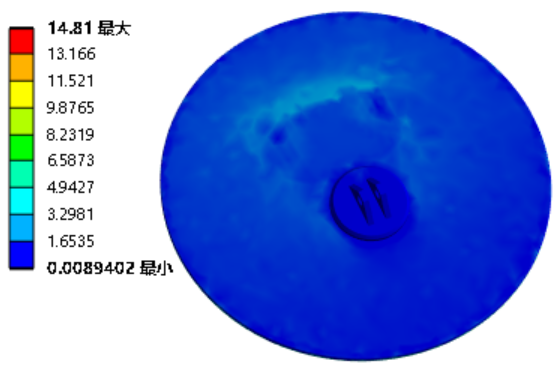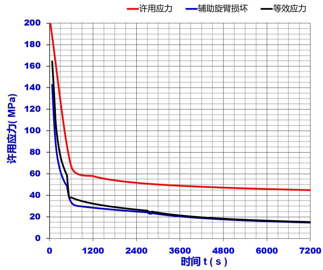 图5 温升曲线 通过这种分段方法,模型能够细致地捕捉蝶板在不同条件下的行为,从而为设计提供可靠的数据支持,并有助于蝶板在高温环境下的性能满足工业应用中的严格要求,尤其是耐火型穿地通风密闭阀这类关键组件。 3.4 结果与分析 图6~图9为蠕变分析的结果,对比了辅助旋臂是否损坏两种情况下的分析结果,特别关注了蝶板在长达两小时(7200 s)高温暴露后的性能指标。 在对蝶板进行最大应力分析时,发现在辅助旋臂未受损害的条件下,蝶板承受的最大应力为15.2 MPa,而辅助旋臂损坏的蝶板最大应力为14.81 MPa,结果详见图6。该应力水平显著低于304L不锈钢的屈服强度,确保了蝶板在高温环境中的结构稳定性和安全性。具体而言,各温度阶段的等效应力值均未超出304L不锈钢的许用应力范围,具体数据如图7所示,表明在持续的高温作用下,蝶板能够维持其结构的完整性,并具备充足的安全余量以应对可能的应力挑战(即使辅助旋臂受损的情况也能满足)。因此,在高温工作条件下,该蝶板的设计是可靠的,能够满足耐火型穿地通风密闭阀在严苛环境下的长期运行要求。
