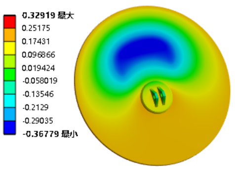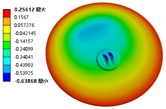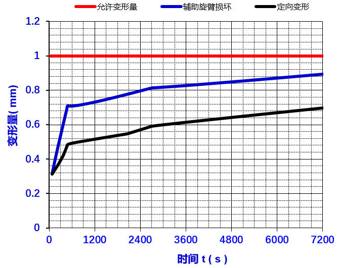 图7 各温度时间段的等效应力值 在对蝶板进行最大变形量分析时,辅助旋臂损坏时的蝶板最大变形量为0.895 mm(注:此处为最大值+最小值,不同方向变形量的叠加,即0.256+0.639=0.895 mm),显著低于设计允许的最大压缩量1 mm,如图8所示;此外,各温度阶段的变形量均低于1 mm,如图9所示。该结果表明蝶板与密封件之间的密封性能在高温环境下不会因过度变形而受到影响,维持了系统的整体密封性和可靠性。因此,在极端条件下该蝶板的设计仍能有效防止泄漏,保证耐火型穿地通风密闭阀的正常运行。