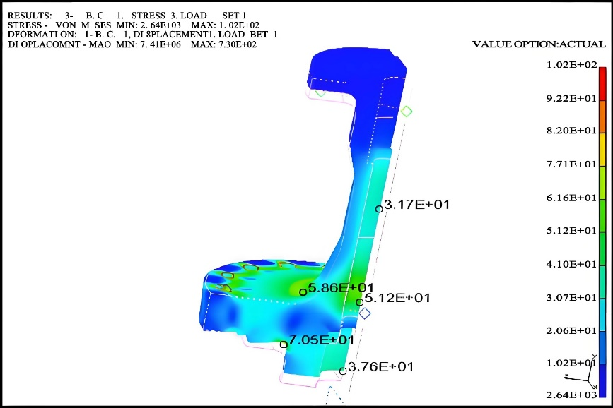 图1 承压件温度分布图 (2)结构强度保障:依据BS 6364及MSS SP 134标准,采用有限元仿真验证优化后阀盖在极端温压交变载荷(设计压力:Class 600,温度:-196℃↔常温)下的抗变形能力,图2是基于优化后阀盖在极端温压交变载荷下的应力分布仿真结果图,最大应力值为1020 MPa,位于阀盖颈部与法兰连接根部,其值低于所选材料S31603在-196 ℃下的许用应力(依据ASME B31.3,约为1250 MPa);最大变形量为7.30×10⁻2 mm,远低于BS 6364和MSS SP-134对低温阀门关键部件变形量的典型限制要求;阀盖的变形主要集中在颈部与法兰连接区域。在极端载荷下,阀盖的最大应力和变形量均在材料许用范围和标准允许的功能变形范围内,验证了优化设计的结构强度可靠性和抗变形能力。