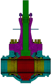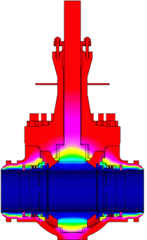 2.1 长颈阀盖结构优化设计 在低温工况下,填料因为温度骤降容易发生形变与结冰的现象,导致弹性功能失效,从而引发阀门启闭力矩异常增大及密封性能的退化。为规避此类风险,采用长颈阀盖结构,通过轴向延伸设计形成梯度温降区,即优化颈部几何参数(长度L、壁厚δ、阀杆间隙d),确保顶部填料函温度维持在冰点以上。其热力学特性需满足以下要求: (1)温度梯度控制:基于热传导方程和有限元热分析方法优化颈部长度L、壁厚δ和阀杆间隙d,典型参考范围为L=300~500 mm,δ=15~25 mm,d=0.1~0.3 mm,具体数值需根据阀门尺寸、压力等级和工况确定。依据上述方法能有效抑制低温介质对阀杆传动区域的直接冷传导,且优化的几何参数组合增大了热阻路径,显著降低了轴向热流密度,避免了金属阀杆与非金属填料因收缩系数差异(如不锈钢α≈16×10-6/℃ vs PTFE α≈110×10-6/℃)导致的配合间隙增大或挤压失效。图1是基于优化参数(L,δ,d)的承压件稳态温度分布仿真结果图,优化后阀门承压件(阀体+阀盖)在稳态热分析下的温度分布范围从最低温度-196.01 ℃(阀体底部接触介质区域)升高至最高温度15.766 ℃(阀盖顶部法兰区域),形成了显著的轴向温度梯度。关键优势在于:填料函区域(图中橙黄色/红色过渡区)温度成功维持在-11~15 ℃范围,远高于LNG沸点(-162 ℃)且高于水的冰点,有效防止了填料结冰;相比于常规短颈结构(填料函温度常低于-50 ℃),该设计大幅降低了填料低温脆化和阀杆卡涩风险;梯度过渡平缓,减少了热应力集中。