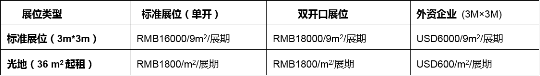 标准展位:(包括三面围板、楣板、一桌二椅、220V电源插座、地毯、清洁费等)。