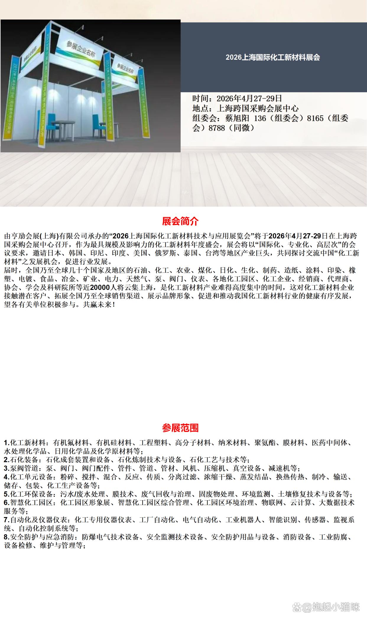 时间:2026年4月27-29日 地点:上海跨国采购会展中心 由亨劢会展(上海)有限公司承办的“2026上海国际化工新材料技术与应用展览会”将于2026年4月27-29日在上海跨国采购会展中心召开,作为最具规模及影响力的化工新材料年度盛会,展会将以“国际化、专业化、高层次”的会议要求,邀请日本、韩国、印尼、印度、美国、俄罗斯、泰国、台湾等地区产业巨头,共同探讨交流中国“化工新材料”之发展机会,促进行业发展。 届时,全国乃至全球几十个国家及地区的石油、化工、农业、煤化、日化、生化、制药、造纸、涂料、印染、橡塑、电镀、食品、冶金、矿业、电力、天然气、泵、阀门、仪表、各地化工园区、化工企业、经销商、代理商、协会、学会及科研院所等近20000人将云集上海,是化工新材料产业难得高度集中的时间,这对化工新材料企业接触潜在客户、拓展全国乃至全球销售渠道、展示品牌形象、促进和推动我国化工新材料行业的健康有序发展,望各有关单位积极参与。共赢未来! 口号:新技术、新产品打造一站式选型采购平台 主题:科技创新、健康发展 顶级盛会 ◎专业、权威,的国际盛会——ICME EXPO 2026将邀请韩国、俄罗斯、印尼、印度、美国、 泰国、日本、台湾等20多个国家和地区近600家知名企业参与,展出面积达35000平米。 ◎技术讲座———ICME EXPO 2026展览期间将同期举行多项的全方位的技术交流活动,学术研讨,务求全面配合展商多元化的宣传策略,讨论行业热门话题,每场费用:国内企业28000元,国外企业4000美元(时间为25分钟、不足25分钟按一场收费)。 “搭建国际采购贸易平台、促进企业交流合作、提高参展效果”————将是我们的目标! 展出范围: 1.化工新材料:有机氟材料、有机硅材料、工程塑料、高分子材料、纳米材料、聚氨酯、膜材料、医药中间体、水处理化学品、日用化学品及化学原材料等; 2.石化装备:石化成套装置和设备、石化炼制技术与设备、石化工艺与技术等; 3.泵阀管道:泵、阀门、阀门配件、管件、管道、管材、风机、压缩机、真空设备、减速机等; 4.化工单元设备:粉碎、搅拌、混合、反应、传质、分离过滤、浓缩干燥、蒸发结晶、换热传热、制冷、输送、储存、包装、化工生产设备等; 5.化工环保设备:污水/废水处理、膜技术、废气回收与治理、固废物处理、环境监测、土壤修复技术与设备等; 6.智慧化工园区:化工园区形象展、智慧化工园区综合管理、化工园区环境治理、物联网、云计算、大数据技术服务等; 7.自动化及仪器仪表:化工专用仪器仪表、工厂自动化、电气自动化、工业机器人、智能识别、传感器、监视系统、自动化控制系统等; 8.安全防护与应急消防:防爆电气技术设备、安全监测技术设备、安全防护用品与设备、消防设备、工业防腐、设备检修、维护与管理等; 展位收费: 参展项目 规格及要求 国内企业 合资企业 外资企业 标准展位 3m ╳ 3m 15800元/个 17800元/个 4000美元/个 角标展位 3m ╳ 3m 17800元/个 19800元/个 4500美元/个 室内空地 36m²起订 1600元/m² 1800元/m² 400美元/m² 展位说明: A.标准展位配置:中英文楣板、日光灯两盏、隔板(高度250cm,可用高度246cm)、洽谈桌一张、椅子两把、可容400W/220V电源插座一个及地毯; B.订光地的展商自行负责展位布置的所需费用,详见参展商手册。 参展事项 1、参展单位详细填写好《参展合同表》并加盖公章,邮寄或传真至组委会; 2、报名后,参展单位必须在3个工作日内将相关费用汇入组委会指定账户; 3、展位安排以“先报名、先交款、先安排”为原则,组委会有权对少量展位予以调整; 4、展品运输、展会接待、住宿等事宜将在开展前三个月组委会另行发送参展商手册。 敬请及时与我们沟通联络,获取最新展会信息 联系单位:亨劢会展(上海)有限公司 电话:021-5415 5272 传真:021-61294697 联系人:蔡旭阳 136 8165 8788