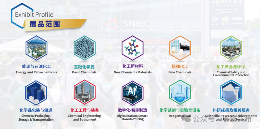 03 展品范围 展会汇聚能源与石油化工、基础化学品、化工新材料、精细化工等知名企业的数万种产品和先进技术。 能源与石油化工:原油、石脑油及大宗石油化工产品;页岩气、LNG等清洁能源;氢能全产业链技术与产品。 化工新材料:有机氟硅材料、工程塑料、高性能纤维、聚氨酯材料、高端聚烯烃材料等。 数字化-智能制造:智能制造关键技术、智慧工厂、工业互联网、云计算、人工智能等。 精细化工:表面活性剂、电子化学品、饲料和食品添加剂、水处理化学品、香精香料等。