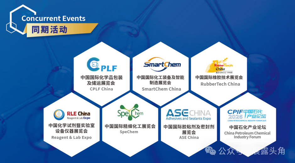 01 展会概况 中国国际化工展览会由中国石油和化学工业联合会主办,中国国际贸易促进委员会化工行业分会和中国化工信息中心共同承办。 展会以“新发展·新格局·共化未来”为主题,聚焦能源、石油和化工领域新产品、新技术、新成就。 在中国“十五五”规划启动的关键时期,展会将为企业提供把握市场趋势、实现共赢发展的有效支撑。 02 规模空前 本届中国石化产业周规模将再创新高,展示面积达155,000平方米,汇聚2,500多家参展商,预计将吸引80,000余名专业观众。 展会覆盖上海新国际博览中心E7、E6、E5、E4四个展馆,呈现化工行业全产业链。