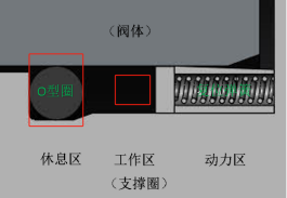 图3 阀座与阀座函随动自适应结构组件 3.3 密封圈双模式工作技术 海底管线属于长输管线,设计使用寿命要求不低于30年。由于海底工况不便维修,阀门密封性能的稳定性要求更高。阀座支撑圈与阀座函之间采用O型圈密封,O型圈的压缩量在GB 1236-76和GB/T 3452.1中有明确规定,一般不做调整。深海球阀介质压力较高,安装的O型圈需要具备防爆破功能,其硬度较高,通常大于邵氏硬度80,高硬度在标准压缩量下易产生较大的永久变形,从而导致密封性能下降。 针对这一情况,本研究为O型圈设计了特殊环槽,如图4所示,环槽分为“休息区”、“工作区”、“动力区”。当阀门全开时,上下游压差较小,阀座函和阀座之间不需要密封,此时O型圈在休息区休息,O型圈处于无压缩状态;当阀门关闭时,上下游压差快速增加,O型圈在介质的推力下向下游运动至工作区,此时O型圈的压缩量达到设计标准,低压密封发挥作用;当压差进一步增大时,介质推力推动O型圈实现压力自密封,使其完全达到零泄漏。工作区前方是动力区,动力区内安装有对开环,对开环内均布安装有多颗压缩弹簧,O型圈在工作区时弹簧压缩于弹簧孔内。当阀门重新打开,上下游压差减小时,对开环内的复位弹簧将O型圈重新推回休息区,预防了O型圈长期压缩导致的永久变形。