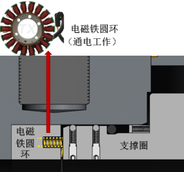 由于工艺需要,三角圈下方安装有插件。插件主要有3个功能,其一是与支撑圈形成燕尾槽,对三角圈起固定作用;其二是插件上加工了斜面,斜面与球面相切,可防止球面与支撑圈接触导致相互划伤;其三是阀门工作过程中,隔离管道中的颗粒物,阻止颗粒物直接划伤三角圈。此外,由于力是相互的,三角圈密封比压低,与之接触的球面受到的挤压也更小,球体使用寿命更长。阀座改进后,测试62台6”Q247X-600LB球阀,仅1台1端泄漏,合格率大于98%,液压舱内测试5台7端泄漏,合格率提高到90%以上。 3 关键技术设计 针对水下阀门的特点,本文提出一种改进型深海球阀。阀座组件首创了电磁力驱动阀座与球体脱离技术、阀座柔性随动技术、密封圈双模式工作技术等3项针对性改进技术,研制出的深海球阀具有水下承压效果稳定、扭矩轻巧、阀座自适应性强、密封件寿命长等特点。 3.1 电磁力驱动阀座与球体脱离技术 扭矩和启闭时间是阀门的重要参数,良好的密封是保证阀门长期安全可靠运行的基础。在深海球阀的设计中,为了实现远程控制,必须安装独立的自动化驱动装置。由于驱动装置同样工作于深海,其体积越大对于施工和维护越不方便,故深海压力越易导致驱动装置变形而出现故障。如何将驱动装置小型化是深海球阀的一项关键技术。 如图2所示,在深海球阀阀座函底部端面各增加一个电磁铁圆环,电磁铁采用多组线圈均布于圆环内,圆环在失电情况下无磁性,在通电情况下线圈产生磁力。线圈组之间安装有螺旋弹簧,电磁铁不工作时螺旋弹簧对阀座提供预紧力实现低压密封,当电磁线圈组工作时,电磁铁提供强大的吸引力,吸引力的方向与介质流动方向相反。设计吸引力的大小取决于管道中的介质压力,需满足电磁铁吸引力-介质对阀座的推力-弹簧预紧力>0。由于电磁力的反向作用,阀座瞬间脱离球体,介质从阀座与球体的间隙高速喷出,高速介质可以将球体表面的污物冲刷干净,具有一定的自清洗作用,降低了设备清洗维护的需求。同时,由于阀座与球体脱离接触,不用考虑球体转动过快对阀座密封面的拉伤,启闭速度可以极快。